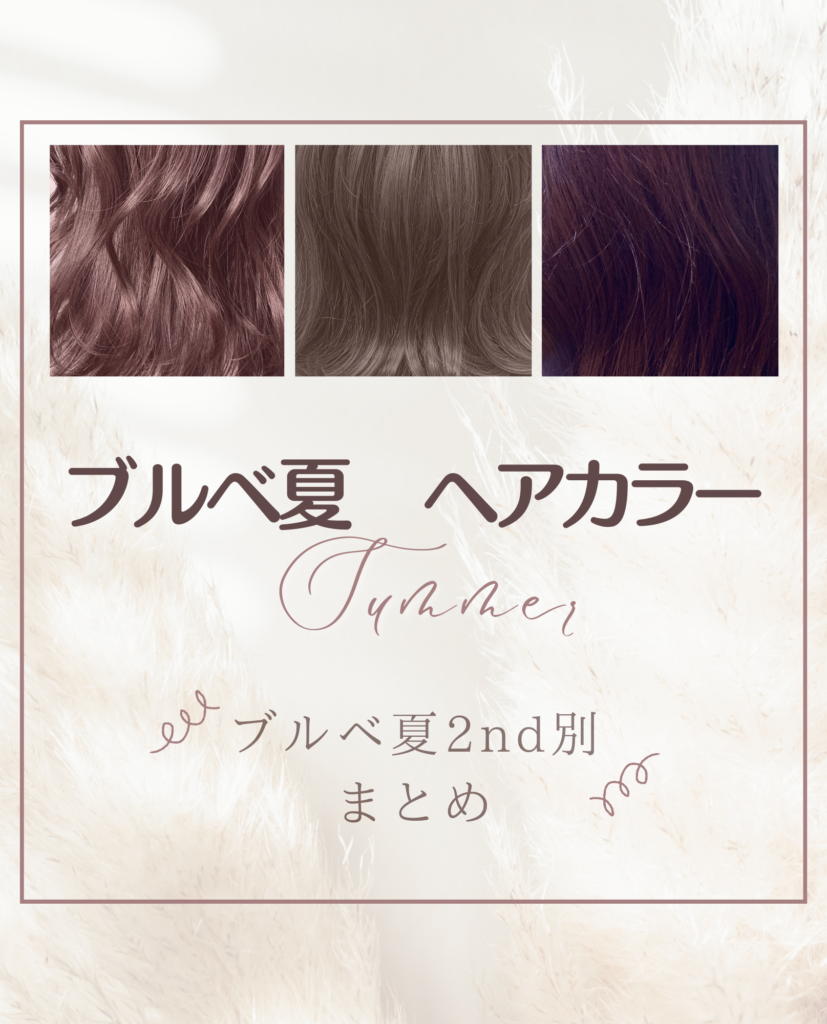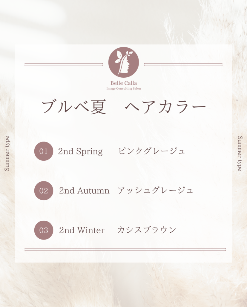 ブルべ夏のヘアカラー 2nd別にご紹介 2022年12月26日 最終更新日時 : 2026年3月3日 BelleCalla ブルべ夏と一口に言っても2ndが違えば特徴も変わります♪ さらに16タイプパーソナルカラー診断だと、より詳しく分かるのです! さらに詳しく ライトサマー、ブライトサマー、ミューテッドサマー、クールサマーに分かれます ヘアカラーさえ得意な色にするだけで、パーソナルカラー的に難易度が高い服やメイクでも 挑戦しやすくなりますよ♪ 全てのヘアカラーの画像は上タブの【SNS】→【Instagramのロゴ】から Instagramをチェック! 着替える・着こなす学校 スクール詳細 カバーリンク BelleCalla公式サイト サービス詳細 カバーリンク